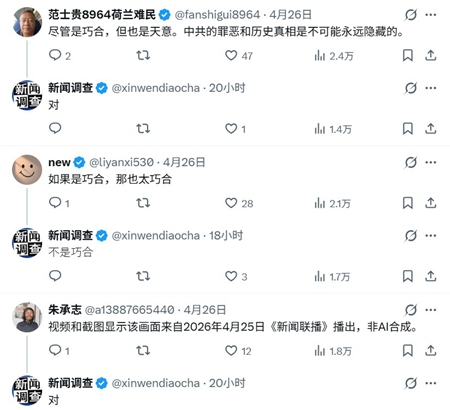 网民针对原始视频和截图确认,该画面来自2026年4月25日中共央视的《新闻联播》,并非AI合成。但值得注意的是,画面中用特大字号标出“8964”字样,因此引发外界联想。