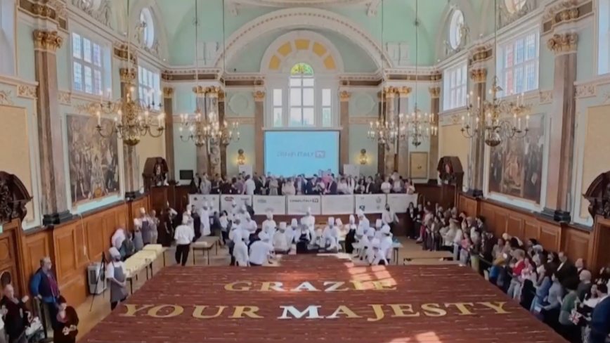 4月26日,在伦敦切尔西老市政厅(Chelsea Old Town Hall),评审正向主厨们颁发“最长提拉米苏”吉尼斯世界纪录证书。来自各地的意大利糕点师连续忙碌两天,只用新鲜食材,合力完成这项甜点挑战。