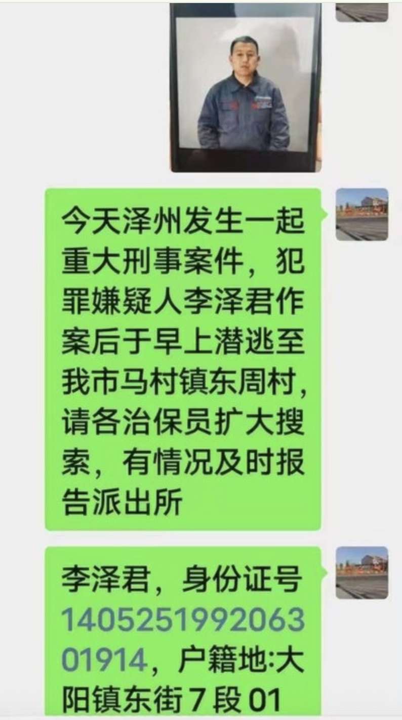 该知情人提供的截图显示,嫌犯名叫李泽君,作案后早上潜逃至马村镇东周村,户籍地为大阳镇东街。