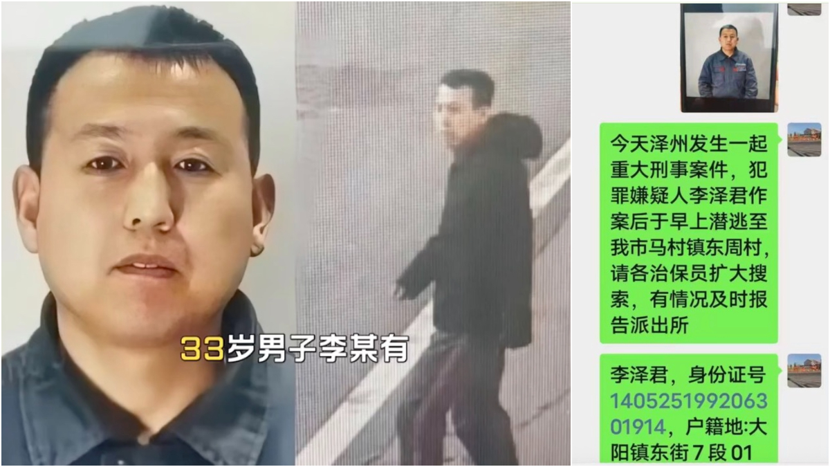 通报描述,犯罪嫌疑人李某,男,33岁,汉族,泽州县人,身高173厘米左右,中等身材,走路微驼背。逃跑时上身穿黑色连帽外套,内穿白色低领秋衣,下身穿深色裤子,黑色运动鞋。