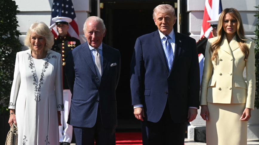 为迎接英国国王,白宫周一在门口就铺上了红毯。川普伉俪亲自到门口欢迎查尔斯三世。
