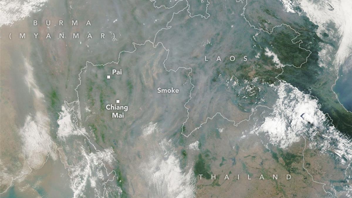 NASA在4月23日指出,该局的泰拉(Terra)卫星上的中解析度成像光谱仪(MODIS)于4月22日拍摄了清迈及其周边地区烟雾弥漫的景象。