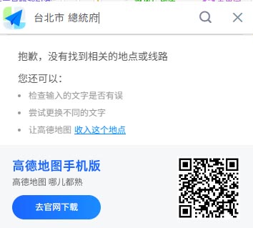 还有一个典型例证,是高德地图针对中华民国总统府的处理。在高德地图上搜索“台湾总统府”,给出的地点是南京市的中华民国总统府旧址。如果换成搜索“台北市 总统府”,则显示“没有相关的地点”。