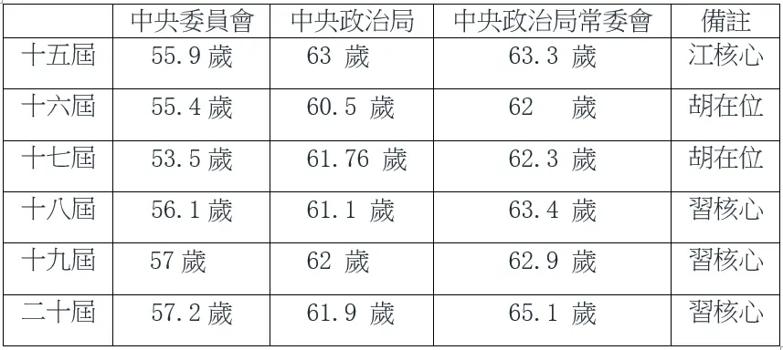 这无形中也使中共干部老龄化加剧。事实上,1997年的中共第十五届中央委员会平均年龄为55.9岁,中央政治局常委会平均年龄为63.3岁;到了“二十届”,习近平大权独揽,这两者的平均年龄分别增加到57.2岁和65.1岁(见下表)。