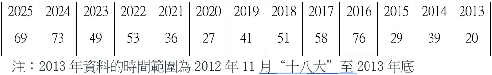 2013—2025习当局宣布查处的省部级官员人数